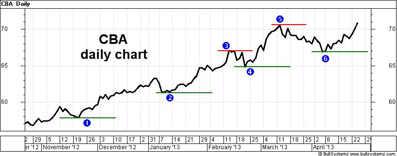 off the table. The daily chart shown here (as opposed to the weekly or monthly chart) of Commonwealth Bank (CBA) is important because it shows the price at which all market participants were happy to settle their positions over-night. On this chart we can see a series of higher peaks and higher troughs — a confirmed uptrend — over the last six months. It also shows short horizontal lines to indicate levels of price support, and resistance. The short lines drawn under the price are the support levels at the price troughs. They indicate progressively rising support levels, and price points where a Stop Loss value could be set. Notice that they are close to whole dollar values — firstly at about $58, then $61, then $65, and $67. Also note that the line “3” at about $67 was a level of resistance. For several days in February, no one was convinced that CBA shares were worth more than $67, so there was a pause in the rising price, and a short sell off back to point “4” at $65. That resistance level at $67 later became a support level in early April (indicated at “6”). This shows the switch in investor opinions regarding fair value at the $67 price point. If the price can clear the last peak at “5” where the daily close was $70.58, then it is likely to continue rising (but not guaranteed). And a Stop Loss could be placed a few cents below the last support level at “6” (the daily close was actually $66.93). If the price breaks below the latest support level, and hence our stop loss level, then the uptrend could be over, and we ought to sell to protect our capital in case a new downtrend is commencing. See more about Stop Loss strategy. ConclusionThe definitions for “over priced” and “over valued” are vague, not reliable, and can be distracting. The study of sectors might be useful, but can be time wasting, resulting in missed opportunities. It can be beneficial to simply follow the price trend on the chart and use sound risk management strategies including a stop loss. At the end of the day, does our own chosen approach seem sensible and protect our capital? More Information?Want to understand more about how to interpret the price charts? See the details in the right-hand column above... |
